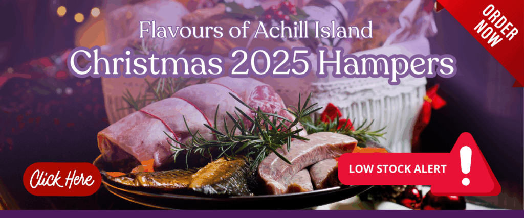 Calvey’s of Achill Island are curating the very popular luxury Flavours of Achill Island Hampers for Christmas 2025 with two sizes for you to choose from. They come in Medi (€139) and Maxi (€189) plus €20 delivery to everywhere on the Island of Ireland. All products are sourced and produced on Achill Island. These luxury hampers are packed with Achill Mountain Lamb joints, sausages, burgers and home-made preserves and sauces, Keem Bay Products smoked salmon and smoked mackerel, with sea salt and treats from Achill Island Sea Salt & much more. Please Order early to ensure availability.